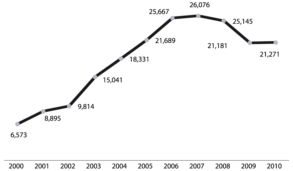 Esa desaceleración se evidencia también en el comportamiento del número de aprehensiones en la frontera sur de los EUA: durante el período 2000-2010, experimentó una disminución de aproximadamente 50% –pasó de aproximadamente 1,636,000 a 404 mil eventos (USBP, 2011)–. Esta disminución se debe a que en los últimos años son menos los mexicanos que están llegando a la frontera con la intención de cruzar al vecino país y, además, a la creciente militarización fronteriza que se ha convertido en una barrera estructural de contención para el flujo de migrantes.