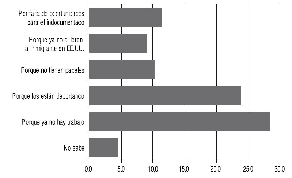 En este escenario, en materia de política pública –específicamente en lo relativo a la demanda de empleo y de servicios de educación y de salud–, es importante considerar que los inmigrantes están enfrentando situaciones de desempleo y mano de obra malbaratada en un ambiente económico, social y judicial desfavorable, lo que ha venido a desestimular la movilidad internacional de la población en Las Vueltas, al mismo tiempo que ha incrementado el número de deportados y empieza a promover el retorno de los que están allá. Así, en el 72.7% de los hogares se percibe que en los últimos años se ha registrado un aumento sistemático en el número de personas que están regresando de los EUA. De ese porcentaje, el 28.4% expresó que los vuelteños están retornando por la falta de trabajo en ese país, el 23.9% porque están siendo deportados, el 12.5% por las redadas y leyes antiinmigrantes y el 11.4% por la falta de oportunidades para el inmigrante no documentado (Gráfico 8).