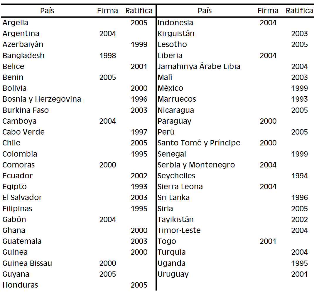 La Convención entró en vigor precedida por una importante campaña mundial para ratificarla, y aunque logró el número requerido de ratificaciones (20) para hacerlo, los 34 Estados parte a junio del 2006 son todos de regiones en desarrollo, de los cuales un tercio corresponden a países de América Latina y el Caribe: Belice, Bolivia, Chile, Colombia, Ecuador, El Salvador, Guatemala, Honduras, México, Nicaragua, Perú y Uruguay. Además, otros dos países latinoamericanos (Argentina y Paraguay) lo han firmado, lo que constituye el primer paso antes de su ratificación. Ahora bien, aunque la región tiene una participación importante dentro del total de Estados parte, todavía queda un gran número de países que no se han pronunciado al respecto (véase cuadro 1).