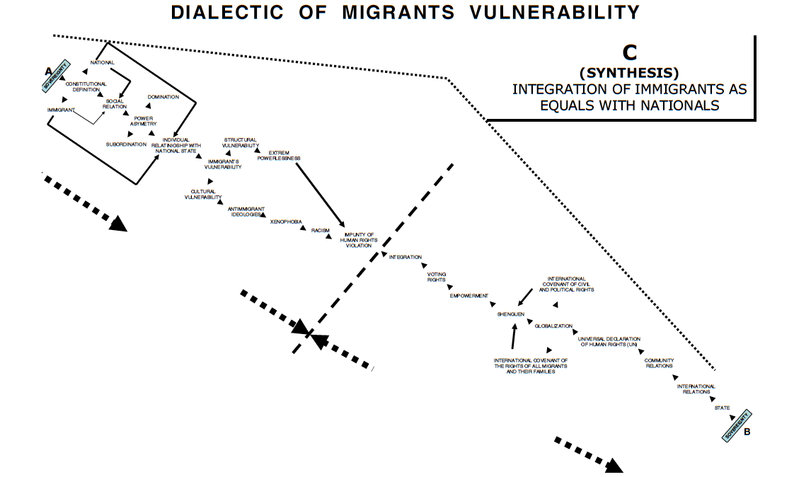 A lo largo del proceso que da lugar a la vulnerabilidad hay una dialéctica que se origina en una aparente contradicción entre dos diferentes ejercicios de soberanía. Esa dialéctica está representada en el diagrama que aparece a continuación. El diagrama parte de la noción hegeliana de un proceso dialéctico en el que se contraponen dos ejercicios de soberanía con objetivos diferentes a manera de tesis y antítesis, cuya síntesis es un cambio cualitativo de la condición de vulnerabilidad. Uno de los ejercicios de soberanía consiste en la definición que, por lo general, hacen las Constituciones de los distintos países respecto de lo que se debe entender por nacional y lo que se debe entender por extranjero. Aunque el legítimo derecho de soberanía del que se deriva el hacer esta definición no implica colocar al extranjero en una situación de subordinación en todas las relaciones sociales que establece con los o las nacionales del país de acogida, en la práctica de esas relaciones la distinción que hace la definición legal entre unos y otros es convertida, o socialmente construida, en un criterio de discriminación de facto mediante el cual los extranjeros acaban siendo colocados en una condición de subordinación respecto de los nacionales, lo que es igual a la imposición de una condición de desigualdad o de asimetría de poder en las relaciones sociales entre unos y otros.