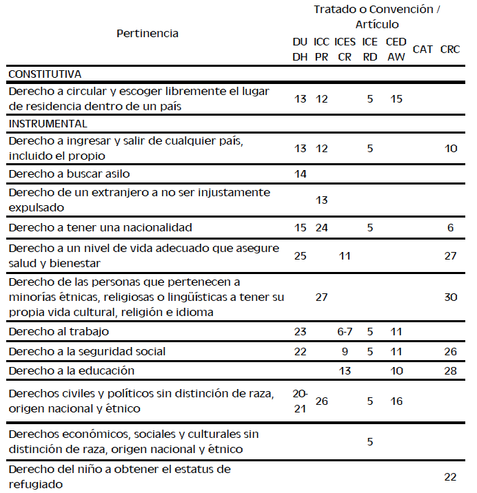 Una estrategia para exigir el respeto de los derechos humanos vinculados a los fenómenos de población y desarrollo debiera incluir ambos tipos de derechos, especificando sus diferencias, alcances y relevancias. Si bien esta perspectiva es útil para diferenciar los derechos a incluir, no permite responder la pregunta sobre los límites o hasta dónde incluir los derechos con pertinencia instrumental a los fenómenos de población. Esto requiere el logro de consensos respecto de cuáles derechos son más importantes que otros para estos efectos15, lo que en última instancia traslada la discusión al terreno ético. Considerando estos aspectos, en los siguientes cuadros presento los derechos humanos con pertinencia constitutiva e instrumental para las variables de población, que son reconocidos en los instrumentos vinculantes de la legislación internacional sobre derechos humanos: ICCPR, ICESCR, ICERD, CEDAW, CAT, y CRC. Por su carácter fundador, y según algunos de ley internacional consuetudinaria (Gostin, 2001) incluyo también la Declaración Universal de los Derechos Humanos (DUDH). No incluyo la MWC, pues es en sí mismo un instrumento sobre un fenómeno de población. (cuadro 1a y 1b)