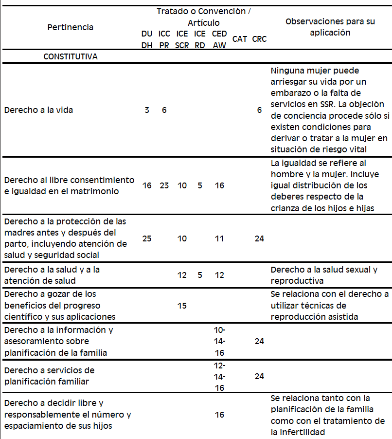 Como se observa, los derechos con pertinencia constitutiva para la fecundidad se refieren a situaciones que habilitan para decidir sobre tener hijos o no, y acceder a servicios de salud, consejería e información. El derecho base es decidir el número y espaciamiento de los hijos, y el de contar con servicios e información para ejercer este derecho.