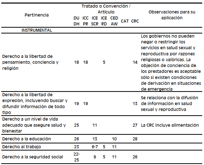 Los derechos con pertinencia instrumental aluden a un conjunto de condiciones que permiten a las mujeres y/o parejas estar en una mejor situación para ejercer su derecho a decidir libremente el número y espaciamiento de sus hijos (educación, trabajo y seguridad social). Incluye también el derecho de toda persona a la vida, que fundamenta la aceptación del aborto inducido en los casos en que peligra la vida de la mujer, respetando su autonomía en la decisión. Por último, se incluyen dos garantías que deben ser respetadas en cualquier estrategia orientada a hacer efectivo el derecho a la autodeterminación reproductiva: el de la libertad de pensamiento, conciencia y religión, y el derecho a la libertad de expresión, incluyendo la búsqueda de información. Ambos se ven violados cuando, a solicitud de ciertos grupos religiosos o fundamentalistas, el gobierno limita o restringe los contenidos de servicios en salud sexual o reproductiva, en función de cuestiones religiosas o valóricas.