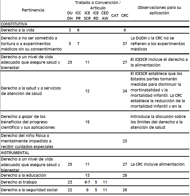 Cuadro 3. Derechos Humanos con Pertinencia Constitutiva o Instrumental para la Mortalidad, reconocidos por la Legislación Internacional
