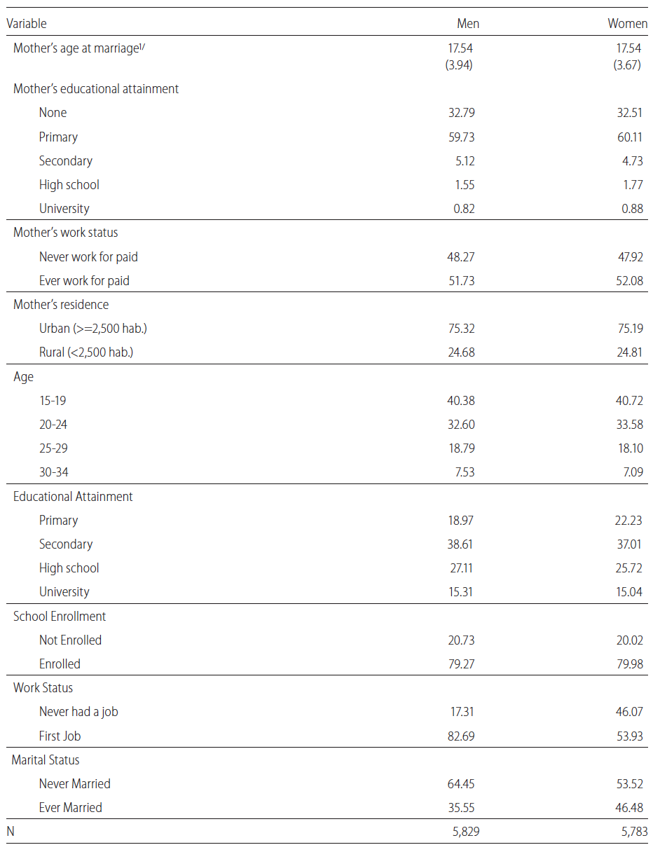 Source: ENPF-1995, data mining.In order to provide answers to my research questions, I estimated a set of nested discrete-time hazard models (Allison, 1982) to evaluate the effects of mothers’ marriage age on children’s transition to marriage. To do so, I transformed the cross-sectional data into person years, generating one record for each year of exposure to the risk of marriage. I assumed the beginning of exposure to be at age 12 (the earliest reported age at marriage in the sample), and censored the never married at age 35. Consequently, the total number of person years was 49,526 for men and 43,670 for women. Separate models were estimated for men and women.