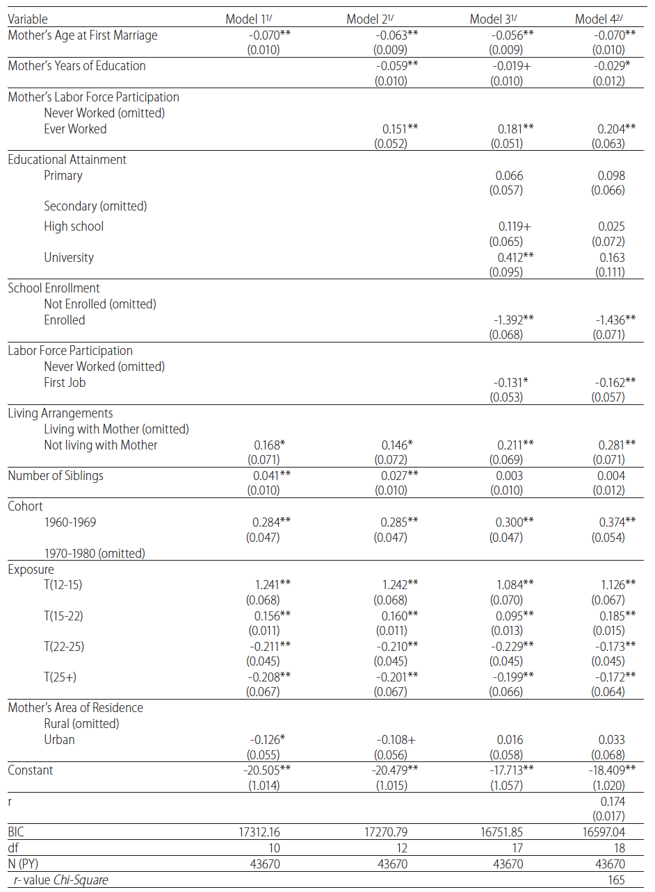 Regarding mothers’ occupation, daughters whose mother ever worked for pay have a 16% higher risk of marriage than daughters whose mothers never worked. Earlier marriage among the former might reflect a situation in which daughters are sharing or are fully responsible of housework, and/or a situation of low socioeconomic status where mothers’ work for pay is a necessity to complement household income. The inclusion of mothers’ occupation and education does improve the model fit according to the BIC. Model 2 has a smaller bic and the difference between bics from Model 1 and 2 indicates very strong evidence of a better fit (i.e., 17,312-17,271=41).