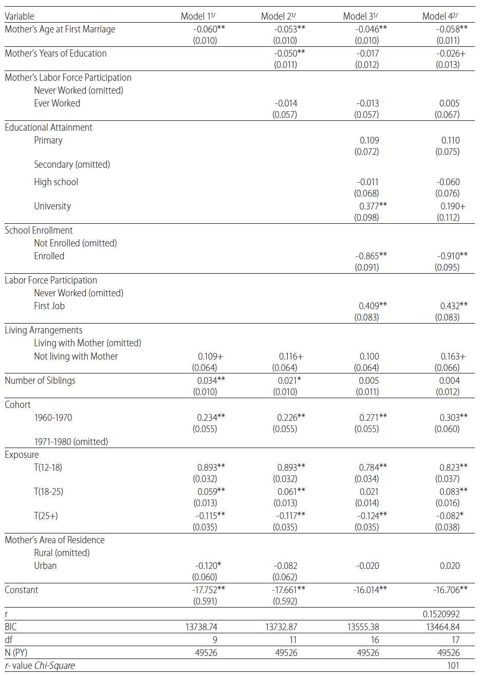 Source: ENPF-1995, data mining.Results from Model 1, presented in the first column, indicate that the risk of marriage is reduced by 7% (i.e., 1-exp(-.07)=.07) for each additional year of age at marriage of the mother. Consequently, the risk of marriage for daughters whose mother married at the age 18 would be 24% higher than for daughters whose mothers married at the age of 22, and 39% higher than daughters whose mothers married at the age of 25. The results of Model 1 are therefore consistent with the idea of a positive relationship between mothers’ and daughters’ age at marriage, suggesting possible intergenerational influences on marriage timing.