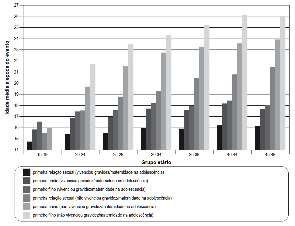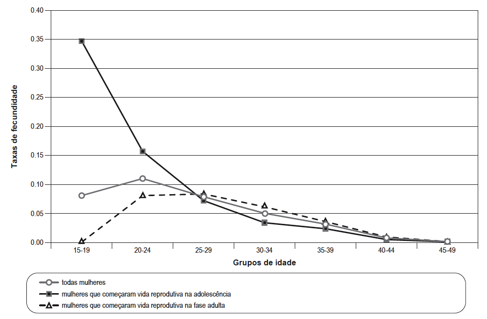 As informações reunidas no Gráfico 1 abaixo dão indicações interessantes acerca do fenômeno. São contrastadas no gráfico dois grupos de mulheres: as que tiveram um evento reprodutivo antes de completarem 20 anos e aquelas que não tiveram. Para ambos os grupos são apresentadas as idades médias à primeira relação sexual, à primeira união e ao nascimento do primeiro filho nascido vivo para mulheres nas diversas faixas etárias à época da pesquisa.
