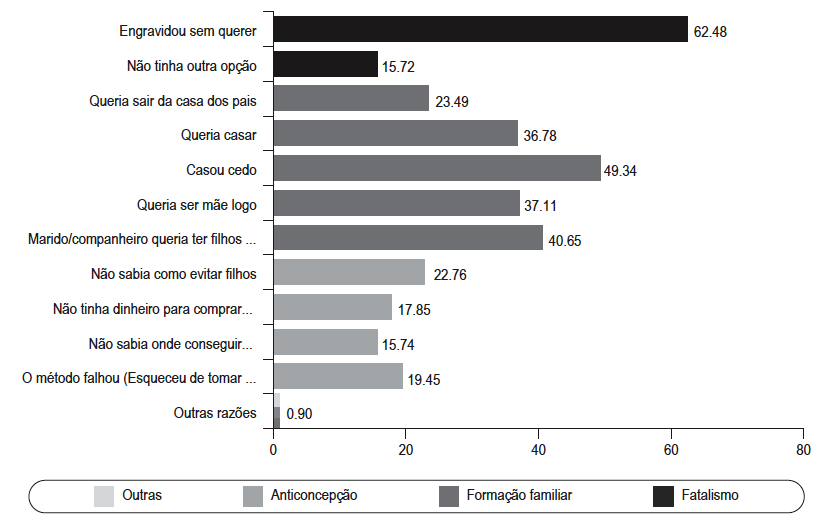 A primeira conclusão é que a maioria das mulheres foi surpreendida pela gravidez. De fato, quando questionadas sobre as razões que acreditam explicar o porquê se tornaram mães 62,48% admite que o filho não foi planejado. Dentre elas destacam-se adolescentes atualmente grávidas que já tiveram um filho antes da gravidez atual. Dentre elas 83,16% declara que engravidou sem querer, não havendo aparentemente dúvidas que não haviam planejado uma segunda gravidez precoce. Note-se também que são as reincidentes que declaram em maior proporção não terem tido outra opção à gravidez, com 40,75% dos casos, enquanto a média de escolha desta justificativa fica em 15,72%, expressando existir ainda certo fatalismo com relação à reprodução8.