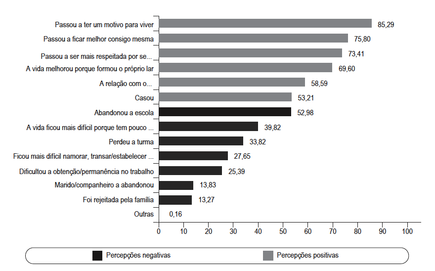 Quando inquiridas sobre as mudanças que a gravidez ou o nascimento de um filho provocou em suas vidas, em geral as mulheres fazem uma avaliação positiva do evento. A maioria absoluta das mães ou futuras mães adolescentes considera que passou a ter um motivo para viver e sente-se melhor consigo mesma. Esses resultados reforçam achados presentes sobretudo na literatura antropológica que já assinalavam que, na ausência de um projeto de vida claro, a maternidade é para muitas adolescentes brasileiras uma espécie de plano de emergência, um recurso extremo para atribuir sentido à existência.