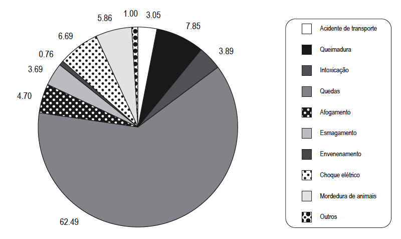 Fonte: PNDS 2006Acidentes envolvendo crianças constituem episódios comuns no dia a dia das famílias em todas as camadas sociais em todo o mundo. A literatura sobre o tema chama a atenção para o fato de o controle de doenças infecciosas e os avanços da medicina no diagnóstico de enfermidades que acometem a infância terem produzido como resultado a preeminência dos acidentes com causa de agravos infantis (Peden et. al., 2008; Baracat et. al., 2000). De acordo com os dados da PNDS 2006, 37,3% das crianças abaixo de 60 meses no Brasil havia sofrido algum acidente nos 12 meses que antecederam o levantamento. Embora a proporção chame a atenção para a relevância deste tipo de episódio durante a infância, o nível de gravidade das ocorrências é de difícil avaliação. Dentre as crianças que sofreram algum tipo de acidente, apenas 10,4% chegaram a ser internadas em instituições de saúde e ¼ delas chegou a ser atendida por um serviço de saúde.