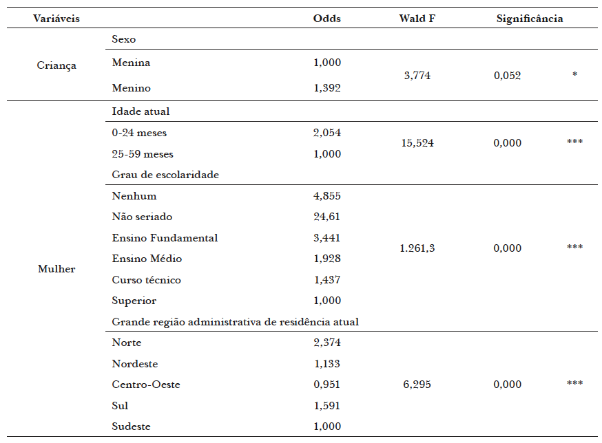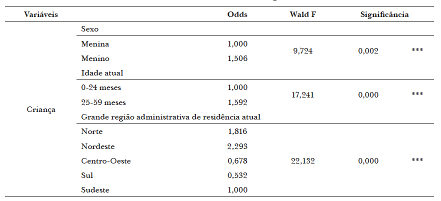 Considerando o modelo multivariável no qual todas as varáveis inseridas são significativas, os meninos têm chance 39,2% maior de apresentarem algum tipo de déficit antropométrico que as meninas. A idade das crianças revelou-se altamente significativa na relação com os déficits apresentados, na presença das demais variáveis. Os dados revelam que as crianças de até 2 anos têm o dobro de chance de apresentar algum tipo de déficit se comparadas às crianças que já superaram os 2 anos mas não atingiram ainda os 5 anos. Da mesma forma, em regiões menos desenvolvidas do país são maiores as probabilidades de as crianças apresentarem algum dos tipos de déficits mencionados. Aquelas que vivem na região Norte têm 2,4 vezes mais chance de apresentar algum tipo de déficit se comparado às crianças do Sudeste do país, por exemplo.
