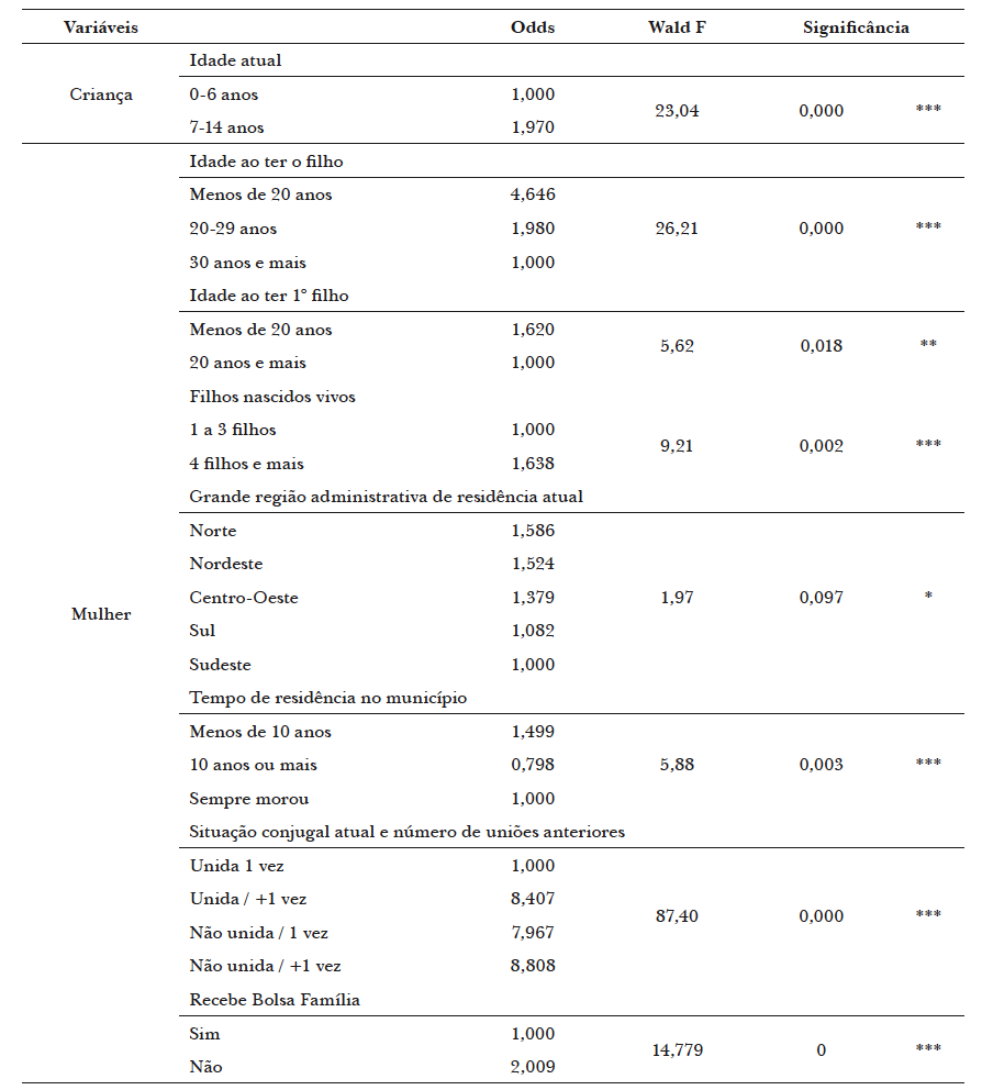 Interessante notar que mulheres residentes em domicílios que recebem transferência de renda de programas governamentais – o Programa Bolsa Família do governo federal - reportam menos a existência de crianças em circulação, apesar de sua condição de vulnerabilidade sócio-econômica. Segundo os dados, a chance de circulação de crianças é duas vezes maior no caso de a mãe residir em domicílio que não recebe o Bolsa Família. Este achado está certamente relacionado ao fato de a elegibilidade para o programa envolver a presença de crianças menores de 14 anos no domicílio e que estas crianças estejam frequentando escola regular. Provavelmente está-se diante de situações que envolvem uma seletividade ou mesmo que o próprio benefício desestimule a circulação infantil.