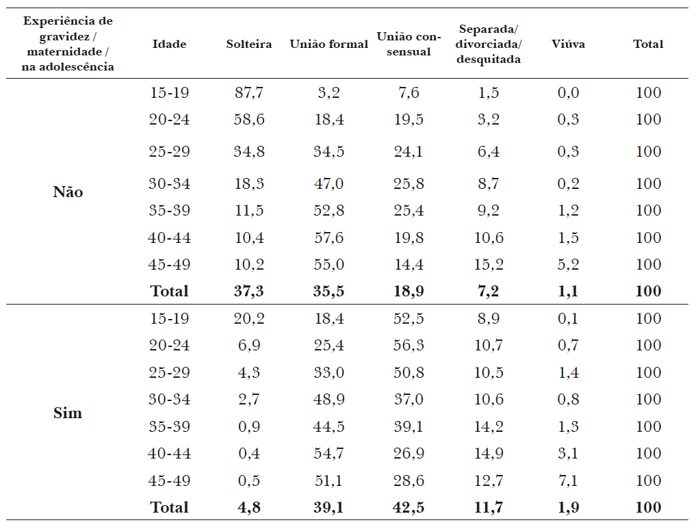 Os dados reunidos na Tabela 3 revelam que a grande maioria das adolescentes (70,9%) que tiveram um evento reprodutivo antes dos 20 anos já se encontram unidas, formal ou consensualmente. O grupo de 15-19 anos é, no entanto, o que reúne uma proporção maior de solteiras, correspondente a 20% das adolescentes que tiveram experiência reprodutiva. Entre as mulheres que engravidaram ou tiveram filhos antes dos 20 anos destaca-se a modalidade de união consensual. A união consensual se mostra mais intensa entre 15-29 anos na população em geral, mas é no grupo que vivenciou uma gravidez adolescente que esta prática é mais acentuada, com proporção superior a 50%.