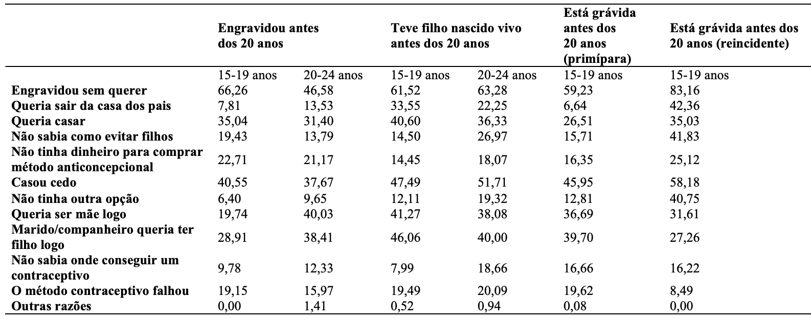 Os dados apresentados evidenciam que o fenômeno da gravidez e da maternidade adolescentes não é novo no Brasil. Quer porque segmentos relevantes da população casavam e casam mais cedo do que outros, quer porque uma gravidez precoce não planejada acabasse por precipitar uniões mais cedo, o fato é que convivemos no país com proporções relativamente elevadas de meninas iniciando precocemente sua vida reprodutiva.