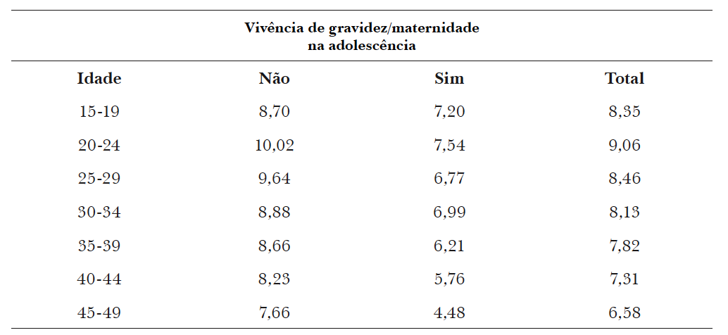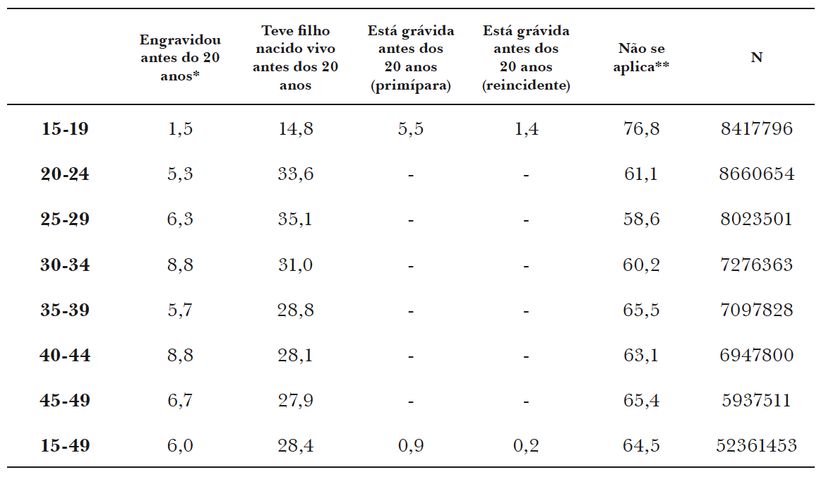 * Estão incluídas mulheres cuja gestação não foi levada a termo até o parto e mulheres que engravidaram com 19 anos, mas o parto apenas ocorreu quando já haviam completado os 20 anos.
