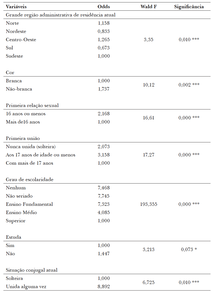A influência de variáveis sócio-demográficas sobre a chance de iniciar a vida reprodutiva antes dos 20 anos foi avaliada por meio de modelo logístico. Neste modelo foram consideradas apenas as mulheres de 15 a 24 anos que já haviam iniciado vida sexual ativa. Foram mantidas no modelo as variáveis que se mostraram significativas em sucessivas avaliações, a saber: região do país onde residem, cor da pele, nível de escolaridade, status escolar atual, idade à primeira relação sexual, idade à primeira união e situação conjugal atual5. Os resultados encontram-se no Quadro 1.