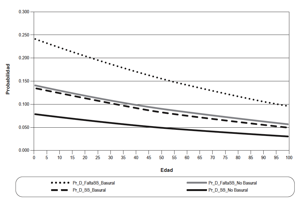 En qué medida la degradación del medio natural también interactúa con la falta de servicios para incrementar los riesgos de padecimiento de enfermedades? La pregunta intentó ser abordada con el análisis realizado para el segundo factor de vulnerabilidad adoptado: la percepción de que los basurales son un problema en el barrio. De dicho análisis se observa que efectivamente el efecto de la falta de servicios de saneamiento es mayor entre la población que vive en barrios donde los basurales son un problema. Cabe notar que este resultado puede deberse al simple hecho de la alta correlación entre el entorno y la condición socio-económica, y que los mecanismos que efectivamente estén operando sean los mencionados anteriormente. Es necesario un estudio mucho más pormenorizado para estimar y entender cómo la degradación del entorno puede ser una vía de contagio de enfermedades de transmisión hídrica entre la población del Conurbano Bonaerense.