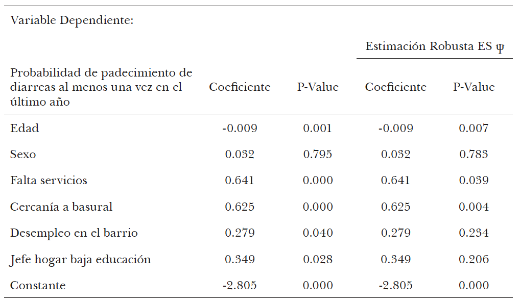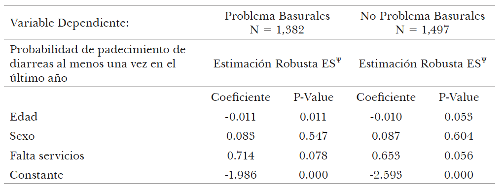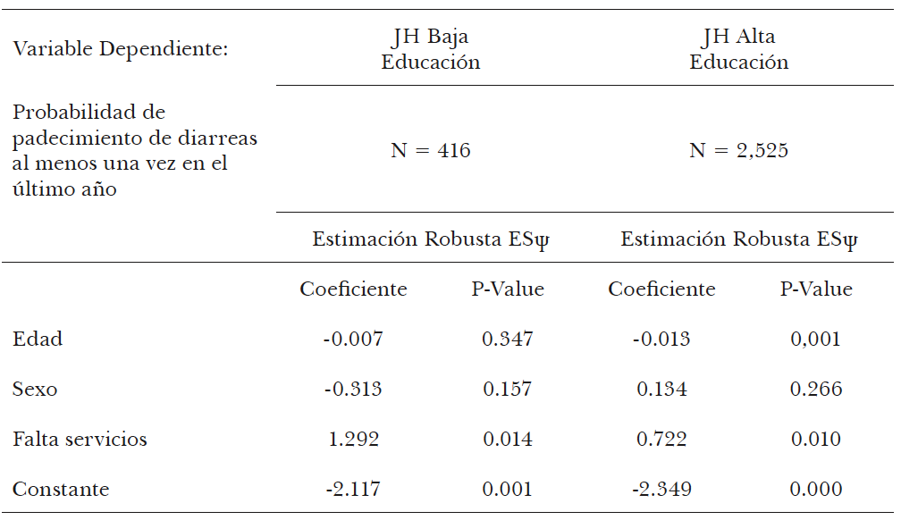 La estimación de los modelos para la población con jefe de hogar con baja educación y con alta educación de forma separada, muestra que la “falta de servicios” tiene un efecto mayor sobre la probabilidad de padecer diarreas entre el grupo de población con jefe de hogar de baja educación, sugiriendo la existencia de un efecto de interacción entre la falta de servicios y la vulnerabilidad socio-económica del hogar, tal como se puede apreciar de los resultados mostrados en el Cuadro 3.