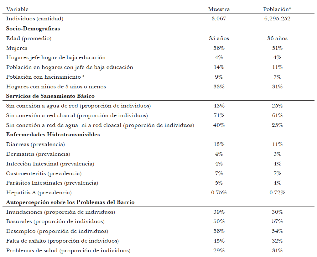 Fuente: Elaboración propia en base a datos primarios para el primer cordón del Conurbano Bonaerense.La edad promedio de la población en la muestra es de 35 años (36 años para la población). Las mujeres representan algo más de la mitad tanto en la muestra como en la población (56% y 51%, respectivamente). Aproximadamente el 4% de los hogares (tanto en la muestra como en la población) tienen un jefe de hogar con nivel de educación bajo (primaria incompleta o menos) y ello significa que el 11% de la población del área bajo estudio, vive en hogares con esa característica. Además, se estima que aproximadamente un 7% de la población vive en situación de hacinamiento – más de 4 personas por cuarto en el hogar - (9% según la muestra) y que en aproximadamente en un tercio de los hogares vive al menos un niño de 5 años o menos.