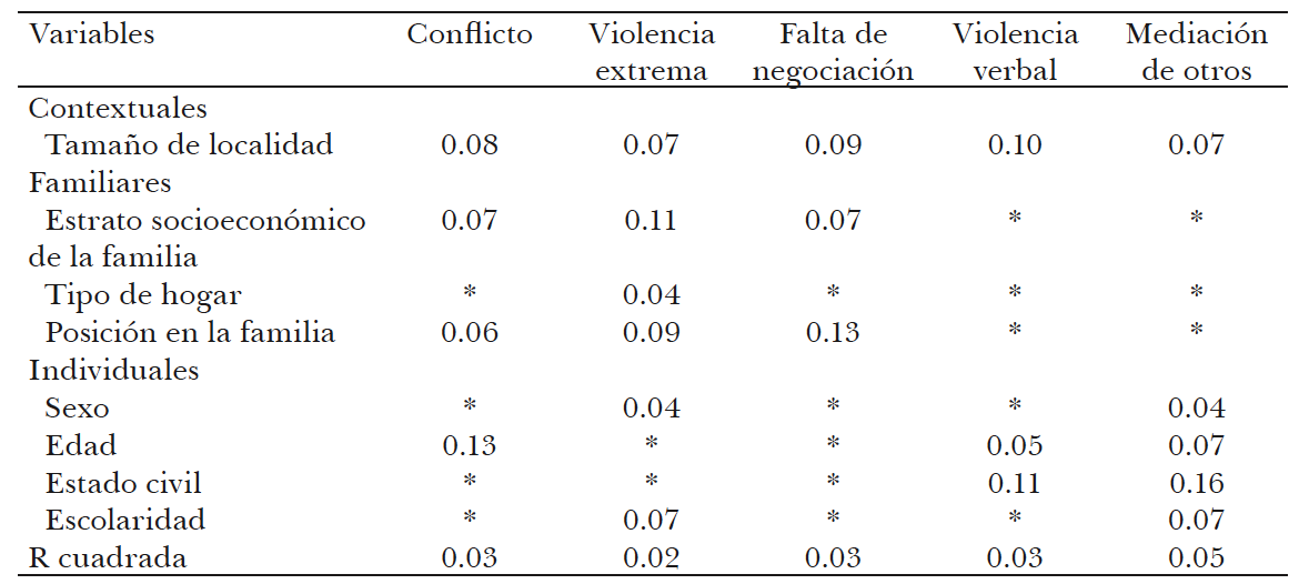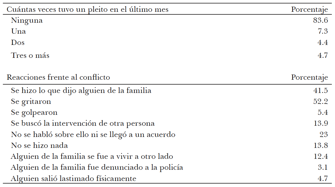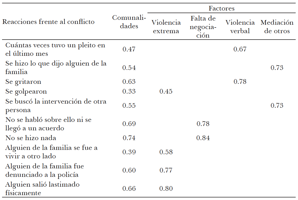 Los datos obtenidos a partir de la ENDIFAM, recogidos en el cuadro 8 revelan que 16.4% de las personas entrevistadas reportó un evento conflictivo en el último mes. Una primera lectura de estos datos sugeriría una baja percepción; sin embargo, si se toma en cuenta que la cifra recoge sólo los eventos del último mes y que las pautas de interacción suelen reproducirse en el tiempo, la magnitud reportada no es nada despreciable. Esta percepción es mayor en el caso de las mujeres que de los hombres. En cuanto a las reacciones frente al mismo, sobresalen en nuestros datos la importancia de la violencia verbal (52.2%) y de la aceptación de la voluntad de otra persona (41.5%) como respuestas habituales. Al someter esta información a un análisis factorial emergieron cuatro tipos de respuestas sistemáticas al conflicto: la violencia extrema, la ausencia de negociación, la violencia verbal y la aceptación de la intermediación de otra persona. En conjunto, todas ellas explican 55.9% de la varianza, un porcentaje nada despreciable (cuadros 9 y 10).