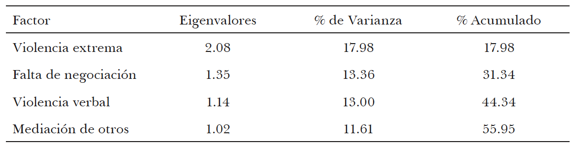 Fuente: Elaboración propia con base en datos de la ENDIFAM 2005Entre todos estos tipos posibles de reacciones, la violencia extrema fue la que absorbió un mayor porcentaje de la varianza (17.9%). Las conductas que se incluyen en ella son: los golpes, el que alguien de la familia se haya ido a vivir a otro lado, el que alguien de la familia fuera denunciado a la policía y el que uno de los miembros del hogar saliera lastimado. Éste es, sin duda, un aspecto de enorme importancia, pues las respuestas agrupadas bajo este primer factor por el análisis estadístico son de extraordinaria gravedad. Se trata de manifestaciones inequívocas de la magnitud del daño infligido a las víctimas, que en la mayoría de los casos, no lo olvidemos, son mujeres. La falta de negociación (no se habló sobre ello, no se llegó a un acuerdo) es el segundo factor en orden de importancia y da cuenta de 13.3% de la varianza. Cabe pensar que las situaciones en las que las desavenencias familiares no encuentran cauces adecuados de expresión no hacen sino postergar la ocurrencia de un nuevo evento, conservarlo latente hasta la siguiente vez. La violencia verbal, que incluye los gritos y una mayor frecuencia de ocurrencia, explica 13% de la varianza. Finalmente, la aceptación de la mediación de otras personas, ya sea porque se hizo lo que dijo alguien de la familia o porque se buscó la intervención de otra persona, recoge 11.6% de la varianza explicada, es una dimensión que apunta hacia la intervención de figuras de autoridad (de ascendencia por alguna razón) sobre el núcleo familiar, ya sea dentro o fuera de éste.18