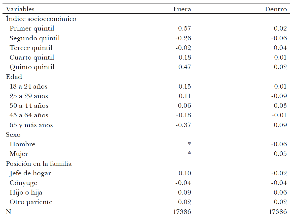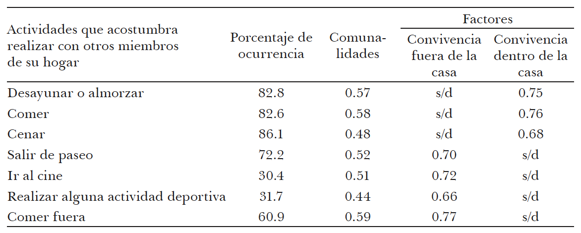 Los resultados del análisis estadístico no hacen sino resaltar la complejidad implícita en el mundo de los afectos y la interacción cotidiana. La aplicación del análisis factorial develó las múltiples subdimensiones en que, a su vez, se escinden aquellas enunciadas por nosotros de forma conceptual. En la población mexicana de principios del siglo XXI, convivir con los otros miembros del hogar alrededor de las tareas propias de la reproducción y/o la recreación se realiza esencialmente a través de dos pautas de interacción diferenciadas, convivir fuera o dentro del hogar, en las que tiene un impacto decisivo el estrato socioeconómico de pertenencia.