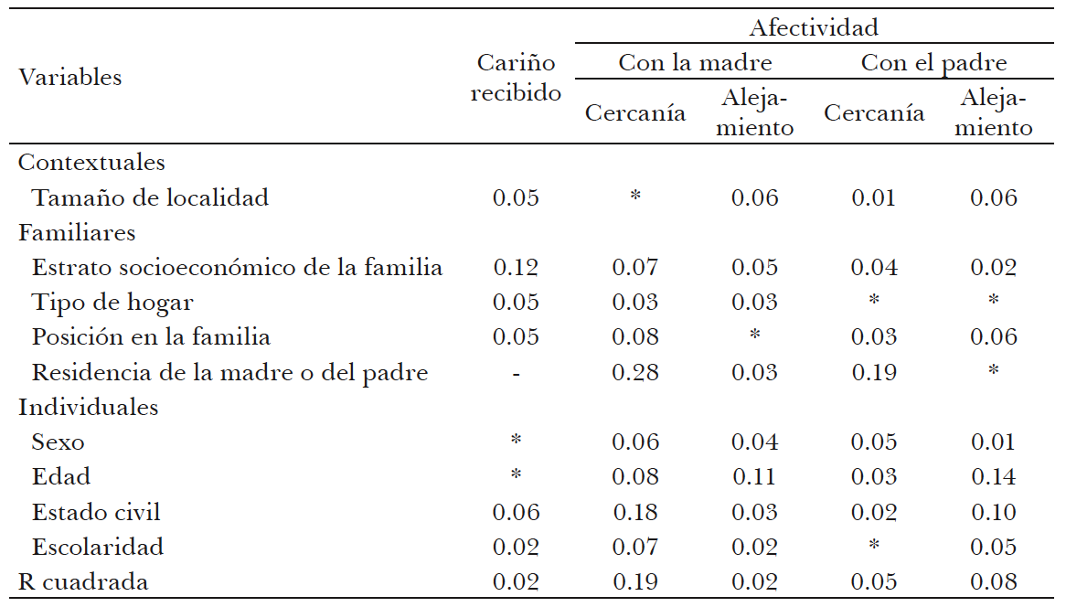 Como veremos más adelante, el sexo y la edad también son importantes en la explicación de los sentimientos hacia la madre y el padre. Pero el aspecto que tiene un mayor impacto sobre la cercanía con la madre y el padre es el lugar de residencia de ellos. Como era de esperarse, la cercanía emocional entre los(as) entrevistados(as) y sus progenitores es mucho mayor cuando habitan en la misma casa (datos no presentados en los cuadros).