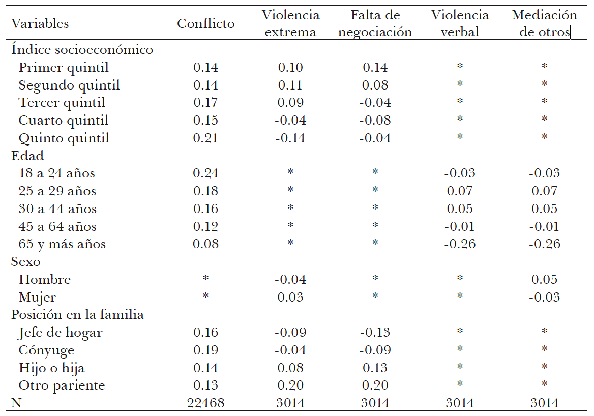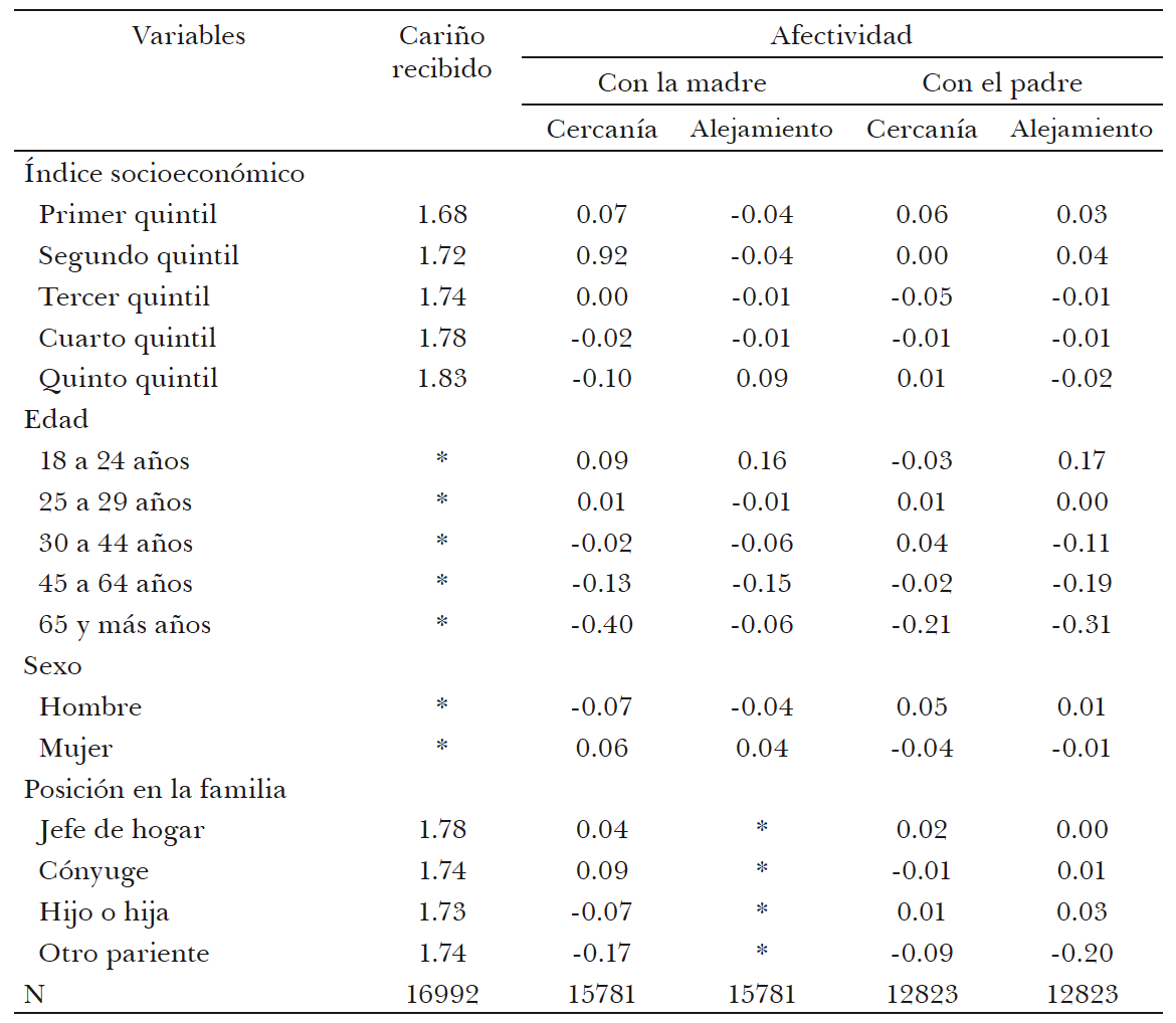 El acercamiento empírico a estas tres dimensiones se realizó mediante el análisis factorial, lo que nos permitió agrupar en factores jerarquizados un conjunto de ítems captados en la Encuesta Nacional sobre la Dinámica de la Familia para cada una de las tres dimensiones analíticas (convivencia, afectividad, conflictividad). Con el análisis de clasificación múltiple calculamos para los diferentes ejes de inequidad, los promedios ajustados de los factores mencionados dentro de cada dimensión, así como los coeficientes beta estandarizados. Entre las variables de control para ajustar los promedios incluimos aspectos contextuales (tamaño de la localidad), familiares (tipo de hogar, posición en la familia y residencia del padre o de la madre) e individuales (estado civil y escolaridad). Este análisis estadístico nos permitió puntualizar el modo en que la clase (estrato socioeconómico de la familia), el género (el sexo) y la edad inciden diferencialmente sobre cada uno de los factores en las tres dimensiones tenidas en cuenta.