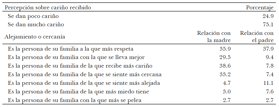 Cuadro 3. México, 2005. Percepción sobre cariño recibido y relación con la madre y el padre (porcentajes)