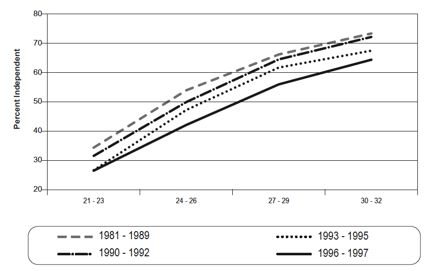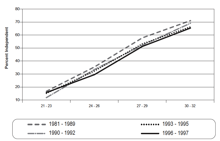 In the first section, we assess the proportion of young people (18 to 32 years old) living independently for the entire period. We then compare the change over time by age groups, sex, and different levels of education (elementary, secondary, post-secondary). Every time different educational levels are compared, the analysis includes only individuals ages 21 to 32, in order to avoid censoring of 18 to 20 year-olds who have not started university.