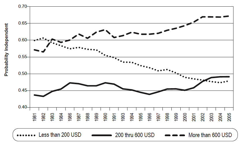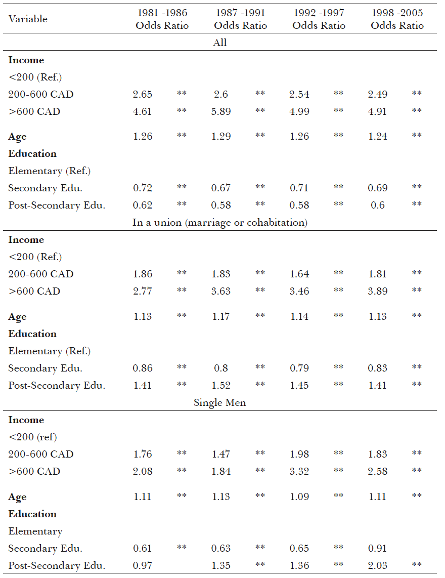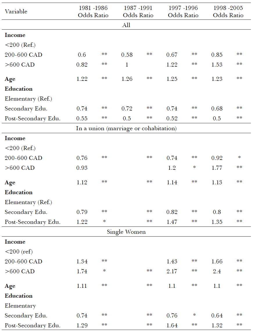 Source: Own calculations based on National Household Surveys data, 1981-2005The direction of the effect of income, as well as its magnitude, is relatively stable throughout the period. Having an income of between 200 and 600 dollars makes the odds of living independently approximately 2.5 – 2.6 times higher than those with an income of less than 200 dollars. Likewise, the odds significantly increase (between 5 and 6 times) for those with an income higher than 600 dollars.