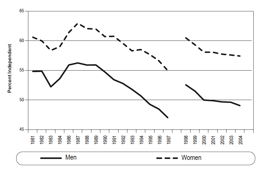 Living independently is defined as being the head of a household, a spouse, or another family- or non-family member living with a same-generation head of the household.