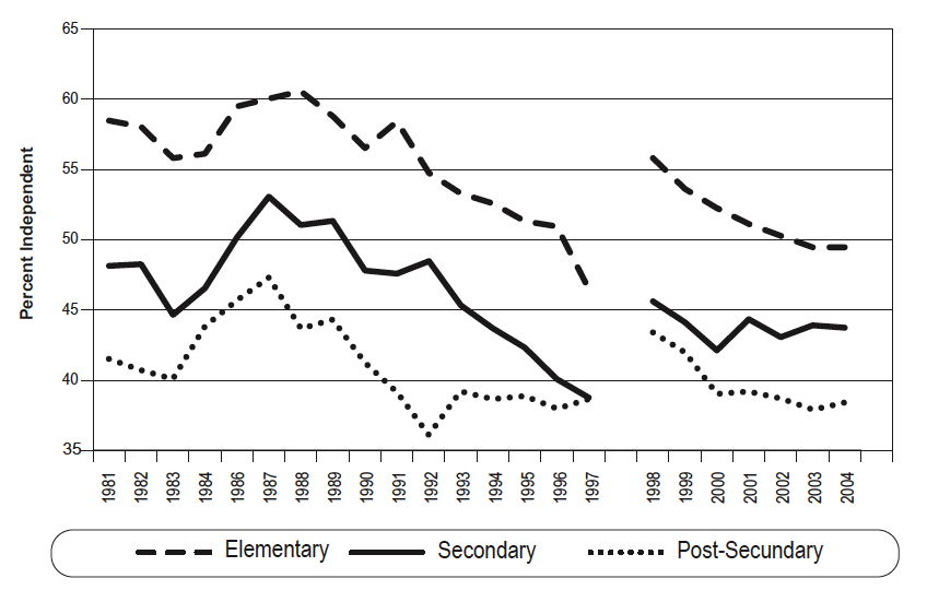 Single young people with post-secondary education have more chances of live independently, because they seemed to be the only group that have significantly incorporated non-family living arrangements as an alternative.