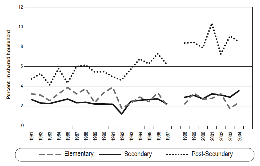 Figure 3 shows the evolution in the proportion of young people living in shared living arrangements. This kind of household seems to be an increasingly popular alternative only for those with higher levels of education. The increase has been marked since 1995, most likely as a response to the postponement of union formation and the need to pool resources with others in order to achieve independence.