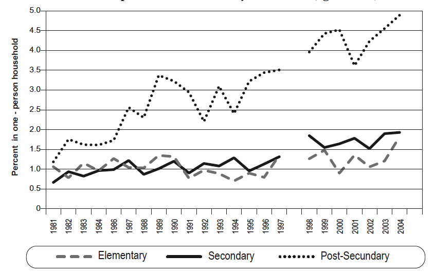 One-person households have followed a similar trajectory (Figure 4). Even though there is a small increase among those with less education, the differences between education levels here are also notable.