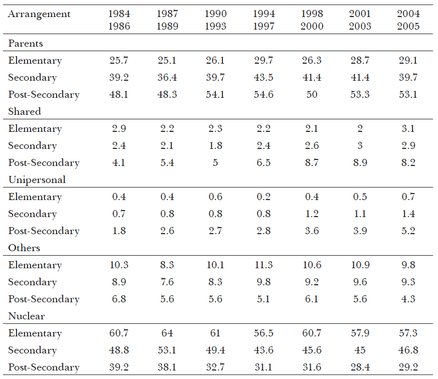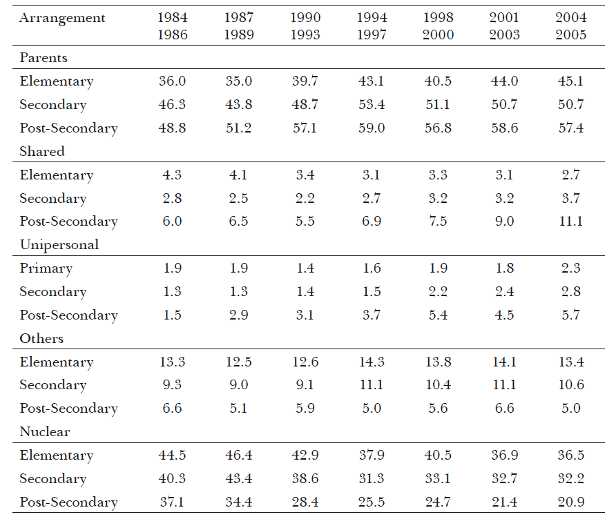 The increase in non-family living arrangements and co-residence with parents has resulted in a reduction in the proportion of young people living in nuclear-family type of households, especially among those with more education. Although this type of living arrangement is still the preferred among those living independently in the three education groups, the difference between the proportion living in nuclear-family households and non-family arrangements (one-person and economic households) among university students and graduates has reduced widely throughout the period.