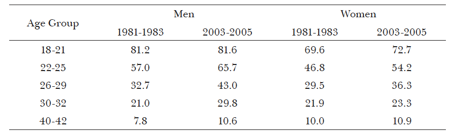 It seems that the formation of non-family living arrangements has made it possible for university students and graduates to avoid further delays in the transition out of the parental home. In fact, when we look at the change over time by age groups, it is clear that the rate of change has been higher for less educated groups (Figures 5 and 6).