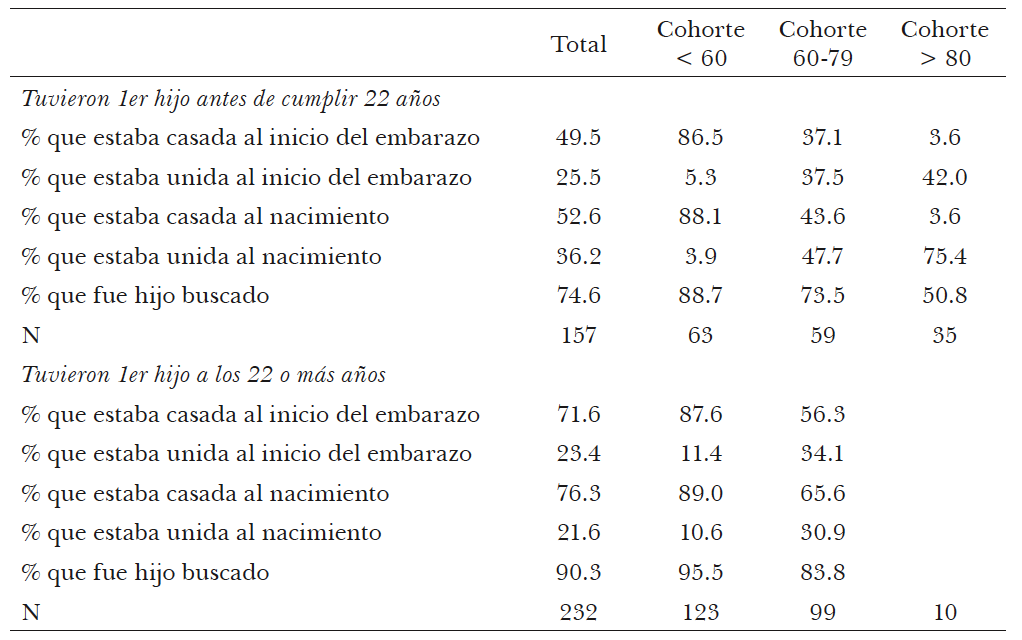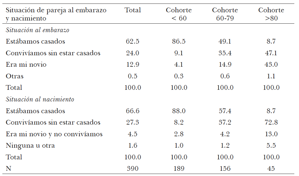 Las mujeres de la generación del 60 y 70, en cambio, presentan pautas diferentes. Sólo la mitad estaba legalmente casada al momento de la concepción de su primer hijo, 1 de cada 3 convivía con su pareja, y el 15 por ciento tenía una relación de noviazgo (sin convivencia). Para el momento del nacimiento, algo menos que 3 de cada 5 estaban casadas con el padre de su primer hijo. En otras palabras, sólo 1 de cada diez de quienes estaban conviviendo al momento de la concepción legalizaron la unión antes del nacimiento. Entre quienes tenían una relación de noviazgo, la mitad optó por la convivencia.