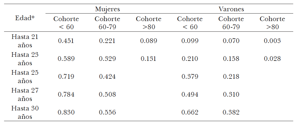 El cuadro 1 muestra la proporción acumulada mujeres y de varones de distintas generaciones que contrajeron su primer matrimonio a distintas edades. Cabe señalar que es ente caso se focaliza la atención en el matrimonio legal, ignorando la convivencia consensual, y fue estimado como se detalló en la sección anterior.