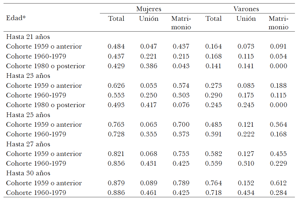 Los resultados permiten observar la dimensión de los cambios en los comportamientos matrimoniales de las distintas generaciones. Así, algo menos de la mitad de las mujeres nacidas antes de la década de 1960 contrajeron matrimonio antes de cumplir los 22 años y 7 de cada 10 ya se habían casado al cumplir los 26 años. Las correspondientes proporciones entre las mujeres nacidas durante la década del 1960 y 1970 se reducen casi a la mitad. Esto es, sólo algo más de 1 de cada 4 se casaron antes de los 22 años y 2 de cada 5 antes de los 26 años. Recién hacia los 28 años, la mitad de las mujeres de estas generaciones contrajeron su primer matrimonio.