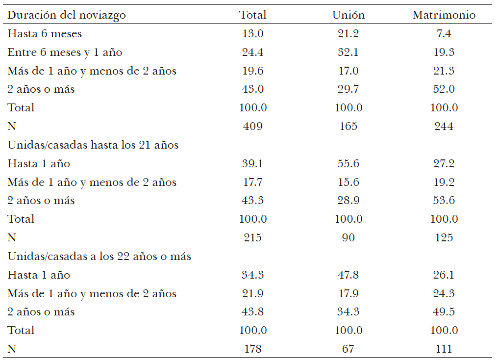 Quienes inician la primera unión a través de una convivencia no se diferencian de quienes se casan directamente en cuanto a la edad y educación de la pareja. Sí se diferencian, en cambio, en la duración del noviazgo previo dado que quienes conviven tienen noviazgos significativamente más breves, independientemente de la edad a la que hagan dicha transición.