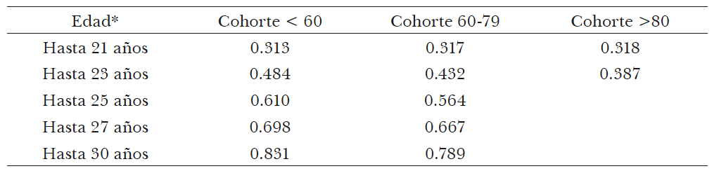 A los efectos de comparar las experiencias de las distintas generaciones se presenta la proporción acumulada que se casan hacia una determinada edad. La probabilidad acumulada a cada de casarse a una edad t se estima como: