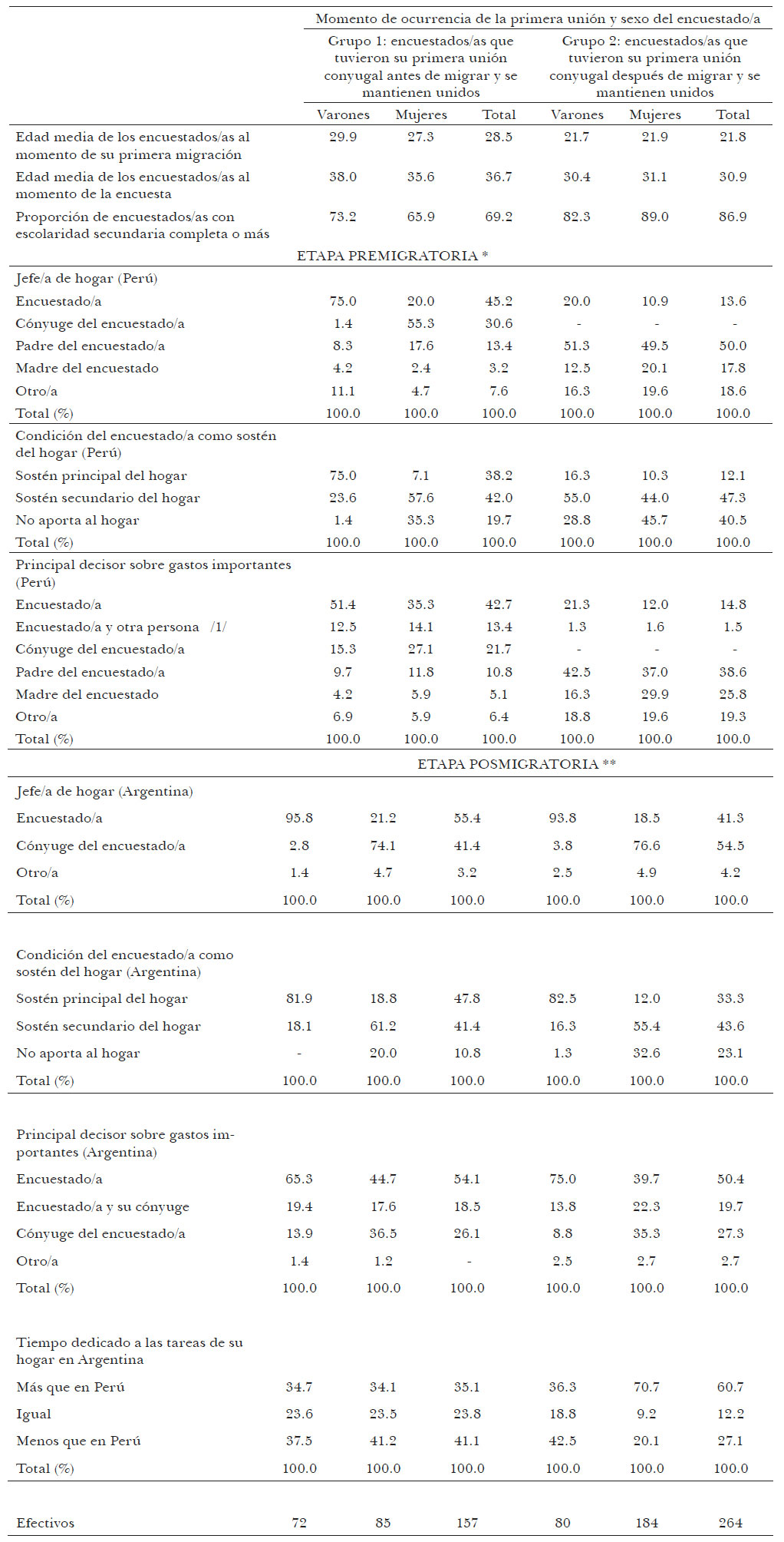 En este apartado consideraremos a los varones y mujeres encuestados que migraron siendo solteros, que experimentaron su primera unión después del movimiento y que se mantienen en ella al momento de la encuesta (tres últimas columnas del Cuadro 1). Como era esperable, este grupo ha experimentado cambios enormes en las variables analizadas. Los varones pasaron de ser sostenes secundarios o no aportantes en Perú, a ser los principales sostenes del hogar en Argentina. Entre las mujeres los cambios son importantes pero menos notables, aunque debe resaltarse que disminuyó 17 puntos porcentuales la proporción de no aportantes y, consecuentemente, aumentaron las sostenes principales y las secundarias.