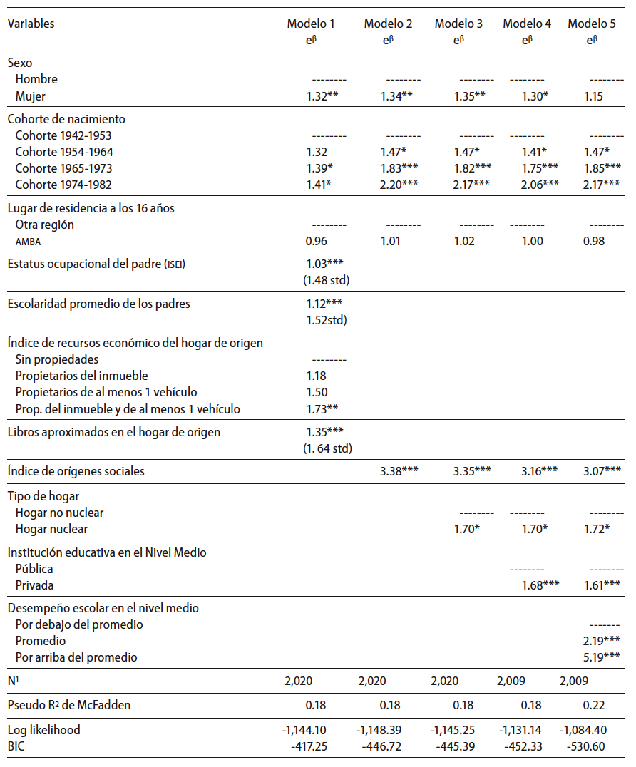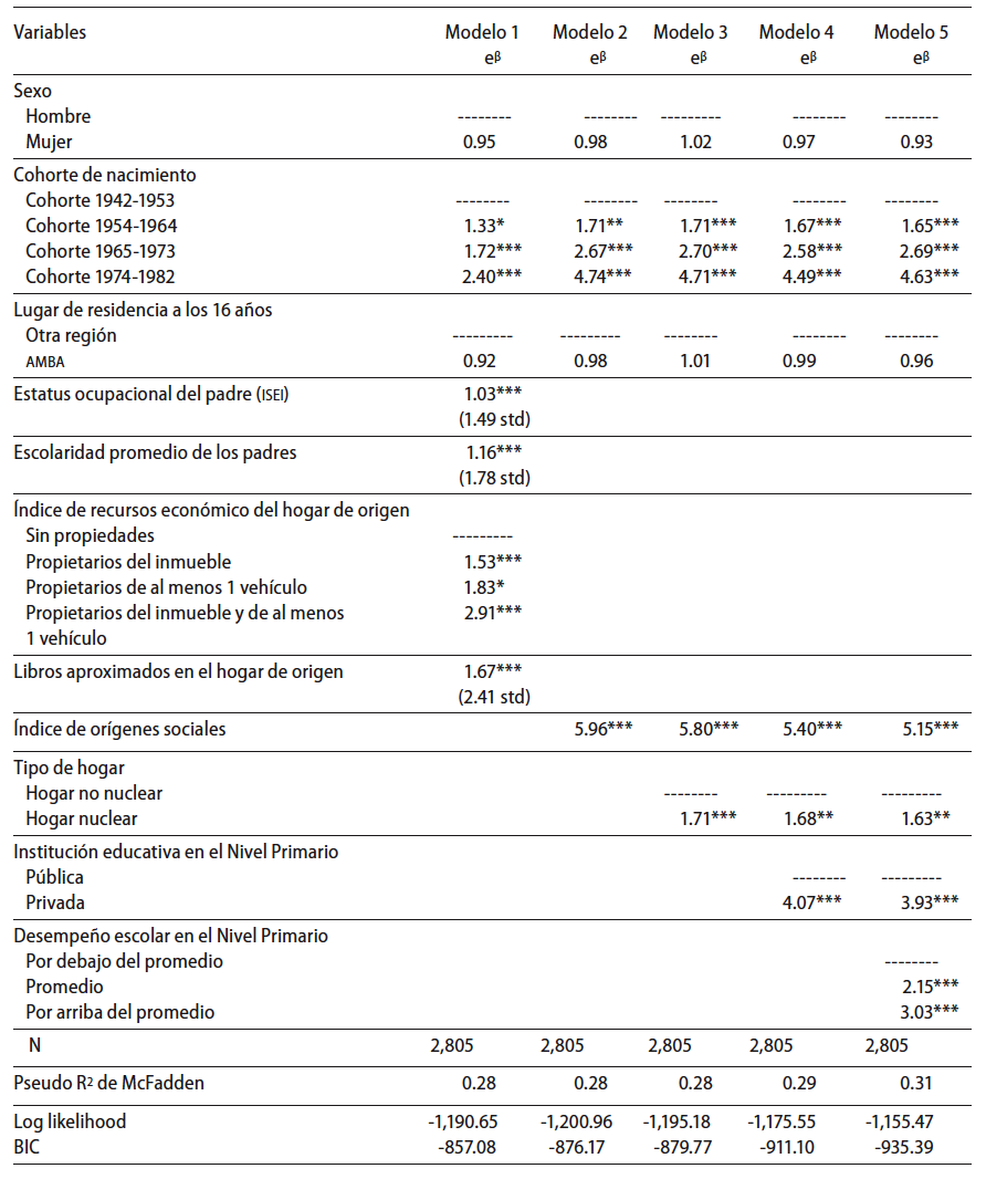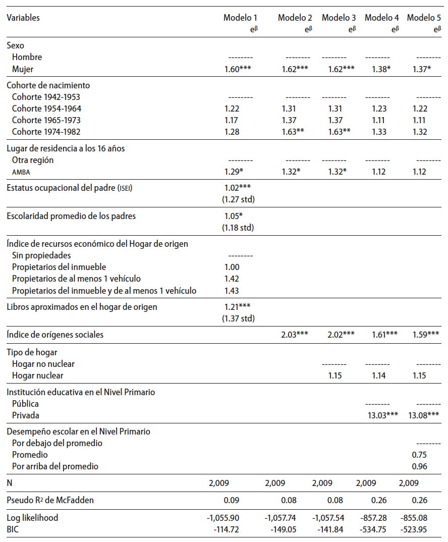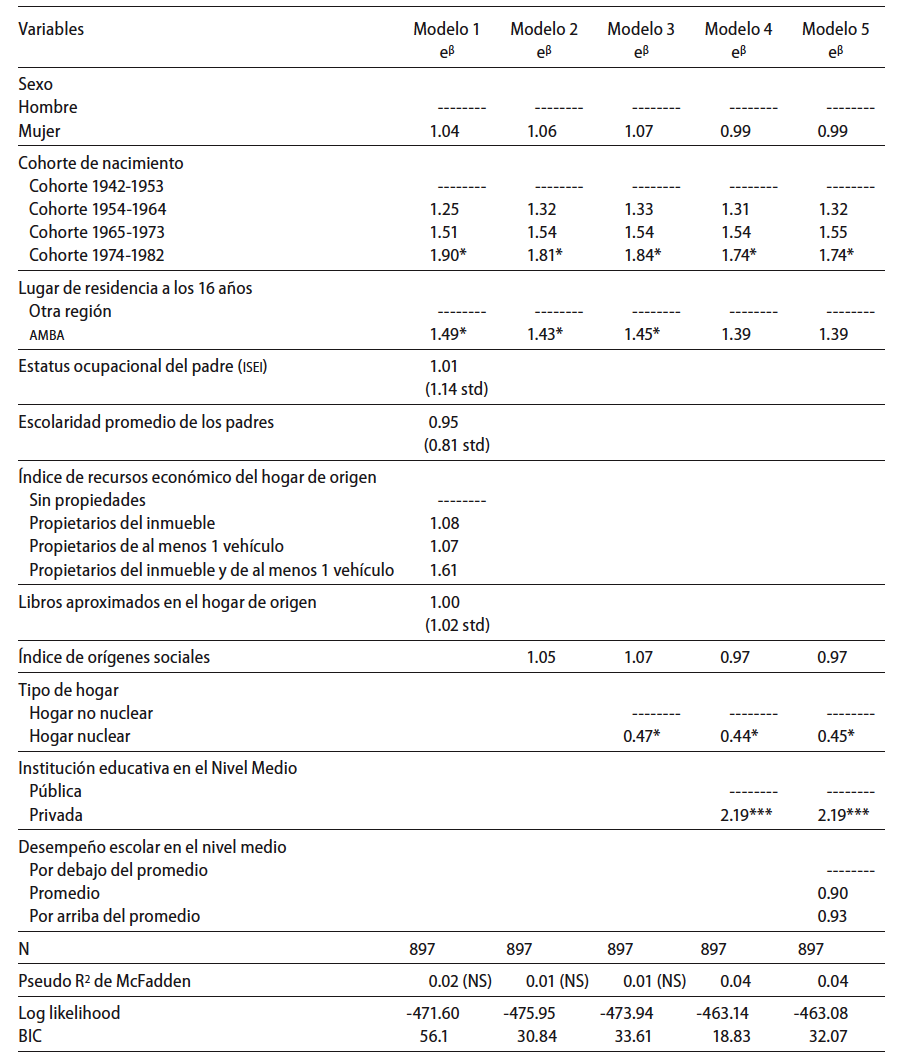 Fuente: Elaboración propia sobre la base de la Encuesta sobre Estratificación y Movilidad Social relevada por el CEDOP-UBA en 2007.Tabla 2. Factores asociados a la progresión educativa hacia el Nivel Educativo Superior. Argentina. Años 1950-2007