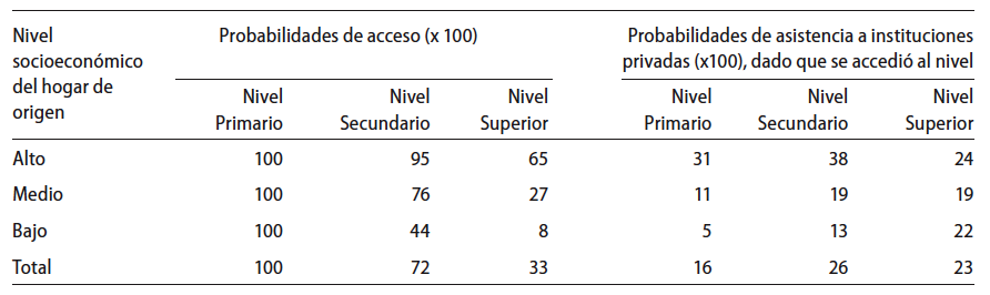 La desigualdad de oportunidades según origen social se manifiesta en el hecho de que los grupos con distintos niveles socioeconómicos están desigualmente representados en cada uno de los niveles educativos (Cuadro 1.A del Anexo): acceden al Nivel Medio el 95 por ciento de quienes provienen de estratos altos, el 76 por ciento de los que pertenecen al estrato medio y un 44 por ciento de los pertenecientes al estrato bajo. Estos porcentajes se reducen a 67, 27 y 8 por ciento, respectivamente, en el Nivel Superior, indicando que las brechas de acceso entre estratos son más pronunciadas en este último nivel.