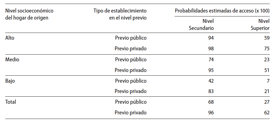 En relación con la evidencia empírica acerca de que la dimensión institucional moldea los resultados educativos, se analizaron las probabilidades de acceso al Nivel Medio y al Nivel Superior, teniendo en cuenta si en el nivel previo se asistió a una institución pública o privada, controlando por nivel socioeconómico del hogar de origen (Cuadro 2.A del Anexo). De acuerdo con los datos, el haber cursado en una institución privada en el nivel previo mejora sustancialmente las probabilidades de acceso tanto al Nivel Medio como al Superior, sobre todo en los estratos socioeconómicos medios y bajos: las oportunidades de acceso al Nivel Secundario mejoran 21 y 40 puntos porcentuales, respectivamente, para aquellos que asistieron a instituciones privadas en el nivel previo.