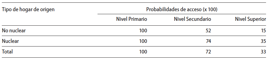 Asimismo, el tipo de hogar pareciera ejercer una influencia para nada despreciable sobre el logro educativo de los individuos, principalmente en el Nivel Superior, donde las oportunidades de ingresar son un 57 por ciento menores para quienes proceden de hogares no nucleares (Cuadro 3.A del Anexo).