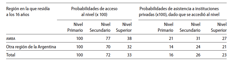 De igual forma, los individuos pertenecientes a estratos socioeconómicos altos tienen mayores chances de asistir a instituciones privadas: por cada unidad adicional en el índice de orígenes sociales, las chances de asistir a una institución privada se multiplican por 2.47.
