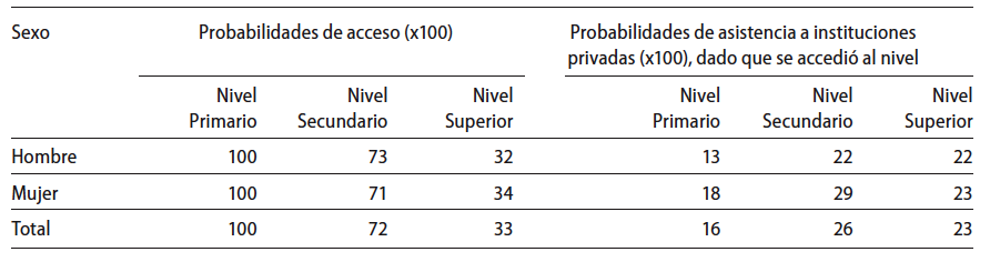 Finalmente, las variables adscriptivas –sexo y lugar de residencia– parecieran condicionar poco el acceso y más los itinerarios educativos públicos o privados de los individuos (Cuadro 4.A y 5.A del Anexo).